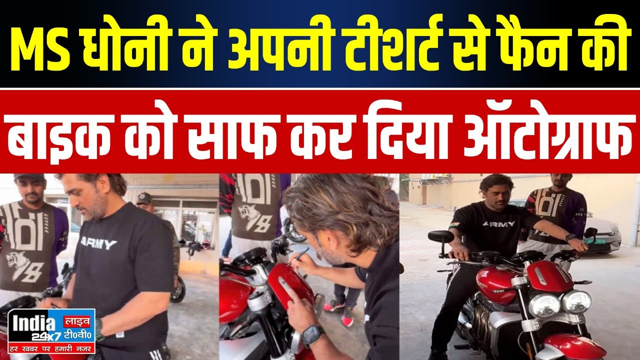 MS Dhoni: महेंद्र सिंह धोनी ने भले ही 3 साल पहले इंटरनेशनल क्रिकेट से विदाई ले ली हो, लेकिन अभी भी उनकी लोकप्रियता में कमी नहीं आई है। एमएस धोनी जहां भी जाते हैं फैंस उनके पीछे-पीछे आ ही जाते हैं। जगह कोई भी हो, लेकिन फैंस को उनका ऑटोग्राफ चाहिए। कोई हाथ पर, कोई कागज पर, कोई अपने फोन के पीछे, कोई डायरी में, कोई टीशर्ट पर, कोई कार पर तो कोई कार की सीट पर उनसे ऑटोग्राफ चाहता है। ऐसा ही एक वीडियो अब वायरल हो रहा है, जिसमें एमएस धोनी अपने एक फैन की बाइक को पहले खुद अपनी टीशर्ट से साफ करते हैं और फिर उस पर ऑटोग्राफ देते हैं।